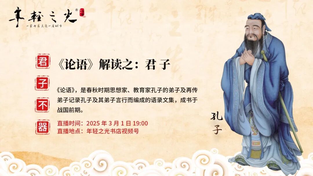 年轻之光共享书店 《论语》解读之:君子 《论语》作为儒家经典,蕴含着诸多对 “君子” 的深刻阐释。活动将从 “君子不器” 的多才多艺,到 “君子坦荡荡” 的胸怀宽广,再到 “君子喻于义” 的重义轻利,全方位解读《论语》中君子的形象与内涵。在互动交流环节,您可以结合自身经历,分享对君子品格的理解与感悟,在活动中汲取经典养分,明晰君子之道,提升自我修养。 活动时间:3月1日 19:00-20:00 参与方式:线下活动、线上直播 活动地址:延庆区环球新意一层