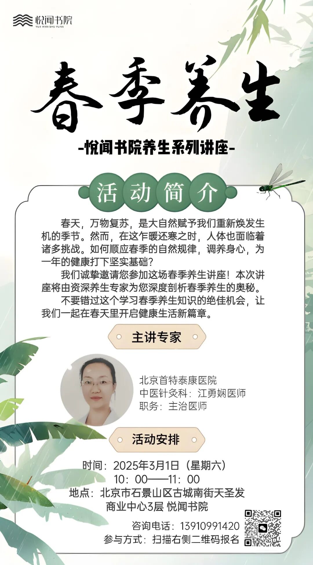 悦闻书院 悦闻书院养生系列讲座——春季养生 春天,万物复苏,然而在换季时,人体也面临着诸多挑战。如何顺应春季的自然规律,调养身心,为一年的健康打下坚实基础?悦闻书院诚挚邀请您参加这场春季养生讲座,本次讲座将由资深专家为您深度剖析春季养生的奥秘,不要错过这个学习春季养生知识的绝佳机会,让我们一起在春天里开启健康生活新篇章。 活动时间:3月1日 10:00-11:00 参与方式:线下活动 活动地址:石景山区古城南路32号