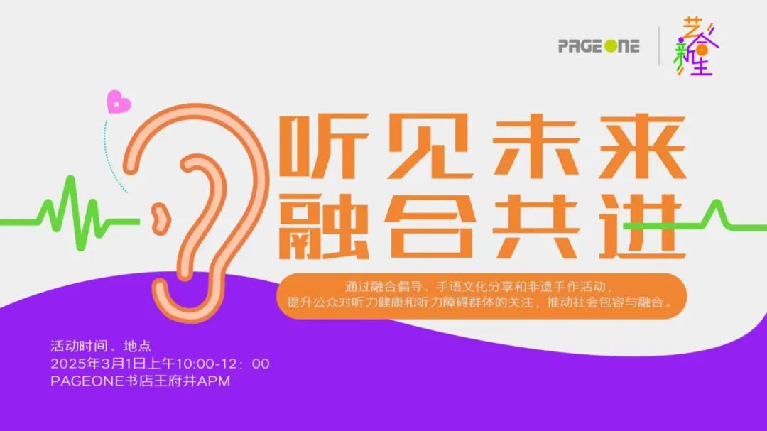 PAGEONE王府井apm店 听见未来,融合共进——全国爱耳日公益活动 还记得蛇年春晚那位用手语传递温暖的主持人吗?这次,他将带领我们走进手语的世界,学习简单实用的手语表达,感受无声语言的魅力。活动现场,还有体验传统手作环节,用非遗竹编技艺制作风铃,将声音化作触手可及的艺术品,在指尖流淌的温暖中,感受传统文化的深厚底蕴。 活动时间:3月1日 10:00-12:00 参与方式:线下活动 活动地址:东城区王府井大街138号apmL427-430号铺 西城区 北京实体书店活动预告