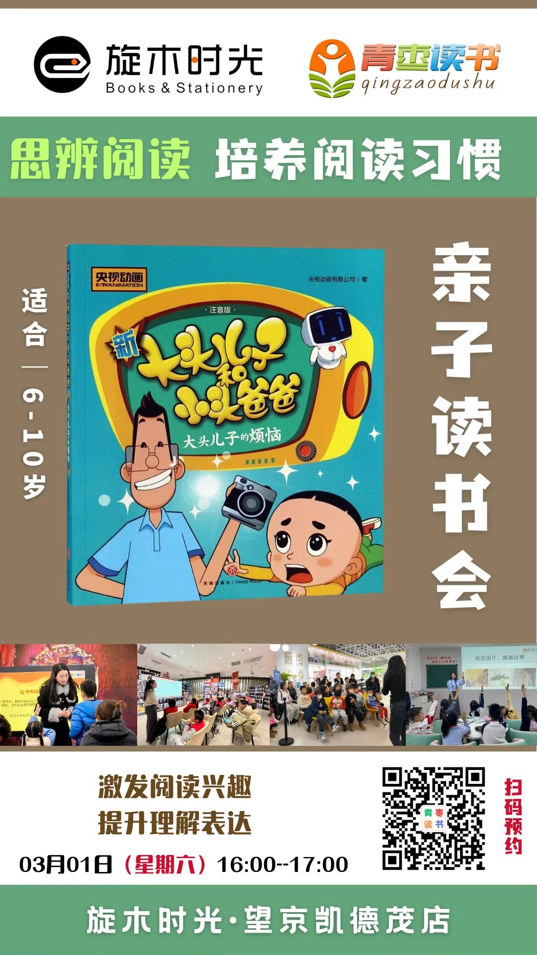 旋木时光望京凯德茂店 思辨阅读 培养阅读习惯——亲子读书会 《大头儿子和小头爸爸》是一部经典的儿童读物,由郑春华创作。书中以大头儿子、小头爸爸和围裙妈妈组成的家庭为主角,围绕日常生活展开了一系列温馨有趣的故事。比如父子俩一起做游戏、为妈妈准备生日惊喜等。故事充满童真和欢乐,能让孩子们在阅读中感受到家庭的温暖与爱,也能让家长从中获得育儿启示,是一部非常适合亲子共读的经典之作。 活动时间:3月1日 16:00-17:00 参与方式:线下活动 活动地址:朝阳区广顺北大街33号院213号楼3层 石景山区 北京实体书店活动预告