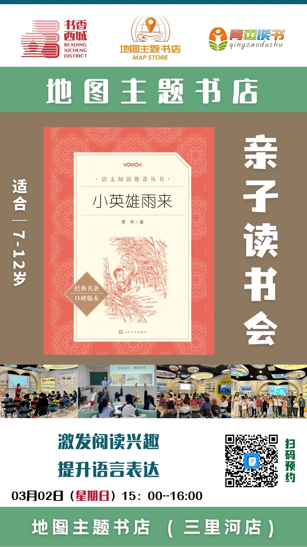 地图主题书店 《小英雄雨来》亲子读书会 《小英雄雨来》是管桦创作的经典中篇小说,讲述了抗日战争时期,晋察冀边区少年雨来的成长故事。雨来生活在芦花村,他聪明勇敢,游泳本领高强。一次,交通员李大叔为躲避敌人藏到雨来家,雨来机智地将他藏好,面对敌人的威逼利诱,他毫不屈服。这部作品展现了中国儿童在战争年代的爱国情怀和勇敢精神,成为影响几代人的红色经典。 活动时间:3月2日 15:00-16:00 参与方式:线下活动 活动地址:西城区三里河路甲50号