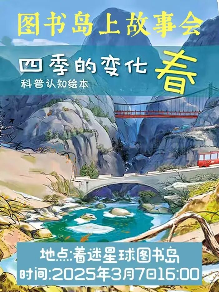 着迷星球图书岛 图书岛上故事会之《四季的变化·春》 春,作为四季之首,开启了一年的序章,蕴含立春、雨水等6个独特节气。活动中,将一同探寻节气与生活的紧密联系。从立春时冰雪渐渐消融,感受冬日向暖春的过渡;雨水时节,体悟细雨绵绵滋润大地;惊蛰一到,见证万物复苏的神奇;春分之际,沉醉于烂漫的花开时节……通过故事分享、互动交流,让大家深入了解春天的每个馈赠,无论大人还是孩子,都能在这场故事之旅中,收获对春天全新的认知与感悟。 活动时间:3月7日 16:00-17:00 参与方式:线下活动 活动地址:顺义区双丰街道着迷星球图书岛 昌平区 北京实体书店活动预告