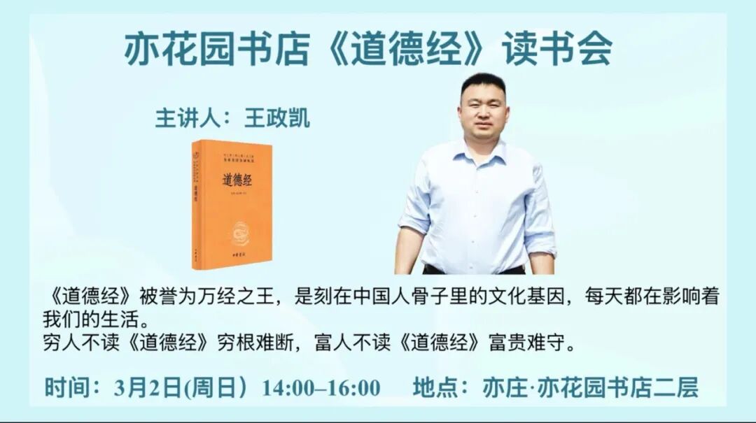 亦花园书店 亦花园书店读书分享会丨《道德经》 在忙碌的生活中,你是否渴望一方宁静的精神家园,探寻古老智慧的深邃力量?《道德经》作为中国哲学的瑰宝,简洁而深刻的文字,蕴含着无尽的人生哲理和处世之道。3月2日,在亦花园书店二层,一杯清茶,一本好书,让我们一起探寻人生智慧,领略经典的魅力。 活动时间:3月2日 14:00-16:00 参与方式:线下活动 活动地址:大兴区亦庄镇小羊坊东200米亦花园创意产业生态园 平谷区 北京实体书店活动预告