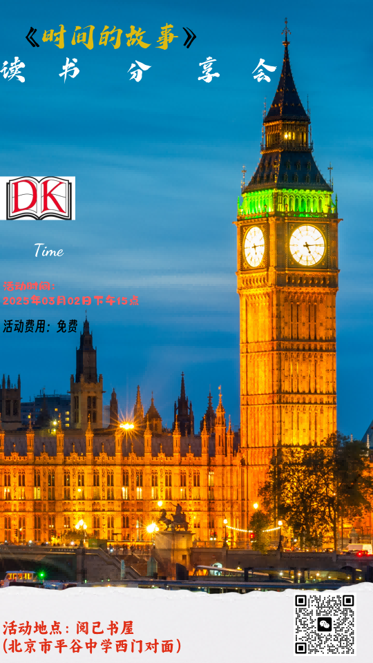 阅己书屋 《时间的故事》读书分享会 《时间的故事》一书从时间的创造、度量、表现、体验、终结五个层面出发,深刻剖析了不同文化对时间结构的想象,记录人类度量时间的方式,展现艺术家对时间的表现,探究人类对时间的感知。近400幅彩图穿插其中,从古代埃及和巴比伦历法,到提香的画作、达利笔下扭曲的时钟,带领读者从文明之初,探索时间的奥秘。 活动时间:3月2日 15:00-16:30 参与方式:线下活动 活动地址:平谷区向阳南街7号东7幢南第4间第5间 延庆区 北京实体书店活动预告
