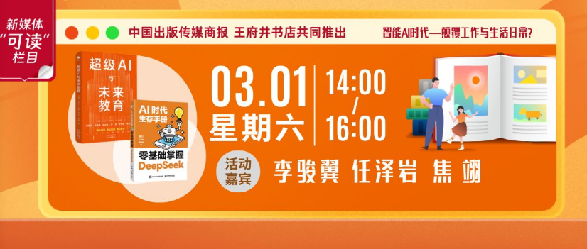 王府井书店 线上阅读栏目“可读”(第三期) | “智能AI时代,颠覆工作与生活日常” 由中国出版传媒商报、王府井书店共同推出的新媒体直播阅读栏目“可读”,将以实体书店为场景推送阅读、对谈活动。本周六,栏目第三期主题“智能AI时代,颠覆工作与生活日常”,将为线上读者邀请未来教育跨界研究者、中国教育三十人论坛特约研究员李骏翼,秋叶集团AI独家讲师、工信部中国电子学会高级AIGC提示词工程师任泽岩,两位嘉宾将与记者焦翊展开对谈,带您深入探索AI如何重塑我们的世界。 活动时间:3月1日 14:00-16:00 参与方式:线上直播 活动地址:东城区王府井大街218号