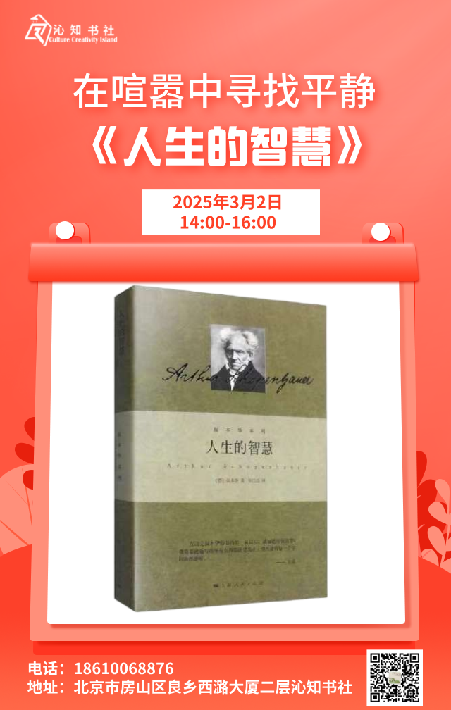 沁知书社 在喧嚣中寻找平静——《人生的智慧》 你是否也在深夜追问:为什么拥有了更多,却依然感到内心空洞?为什么越努力迎合世界,越觉得迷失自我?德国哲学巨匠叔本华在《人生的智慧》中,用一把锋利的思维之刃,剖开世俗幸福的幻觉。如果你厌倦了被焦虑绑架、被社交消耗、被欲望奴役,这本书将像一盆冰水,浇醒沉睡的灵魂,唤醒真正的自由。其实永恒的平静,早已藏在你拥有的精神疆域里。 活动时间:3月2日 14:00-16:00 参与方式:线上直播 活动地址:房山区良乡西潞东里甲一号楼二层 通州区 北京实体书店活动预告